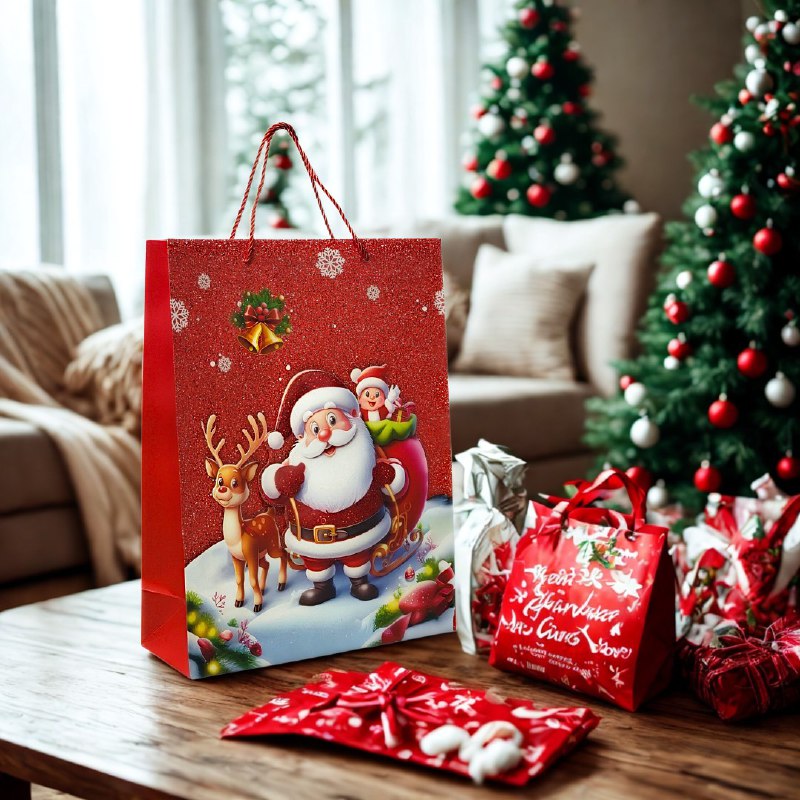 BOLSA DE REGALO NAVIDEÑA GRANDE DE 30X40X12CM, DISEÑADA PARA HACER QUE TUS REGALOS DESTACAN ESTA TEMPORADA. SU TAMAÑO ESPACIOSO PERMITE EMPAQUETAR ARTÍCULOS GRANDES O VARIOS OBJETOS A LA VEZ, FACILITANDO TU PREPARACIÓN NAVIDEÑA. PERFECTA PARA SORPRENDER A TUS SERES QUERIDOS CON UN TOQUE ESPECIAL Y FESTIVO. ¡HAZ QUE CADA REGALO CUENTE CON ESTA BOLSA QUE UNE FUNCIONALIDAD Y ESTILO!