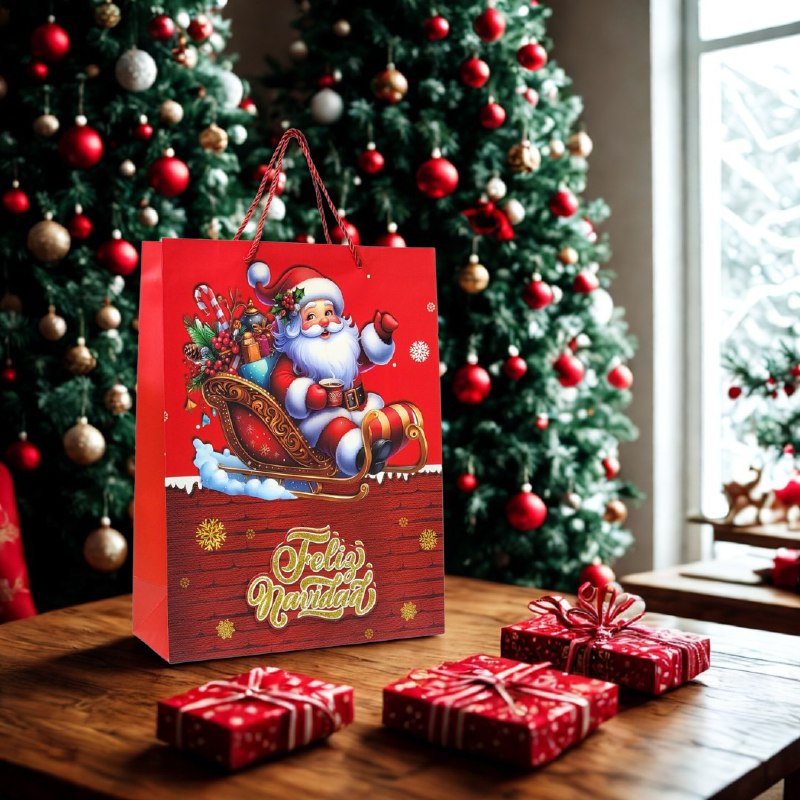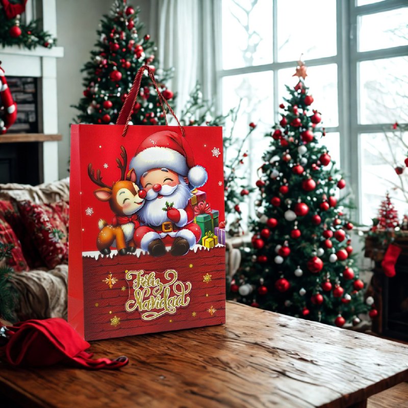 BOLSA DE REGALO NAVIDEÑA GRANDE DE 30X40X12CM, PERFECTA PARA ENVOLVER TUS REGALOS DE MANERA ELEGANTE Y PRÁCTICA. SU AMPLIO TAMAÑO PERMITE COLOCAR ARTÍCULOS GRANDES O VARIOS OBJETOS, IDEAL PARA SORPRENDER EN ESTA TEMPORADA. DISEÑO FESTIVO QUE AÑADE UN TOQUE NAVIDEÑO A TUS OBSEQUIOS, FACILITANDO SU TRANSPORTE Y PRESENTACIÓN. ¡HAZ QUE TUS REGALOS DESTACEN CON ESTA BOLSA RESISTENTE Y ESTILIZADA!