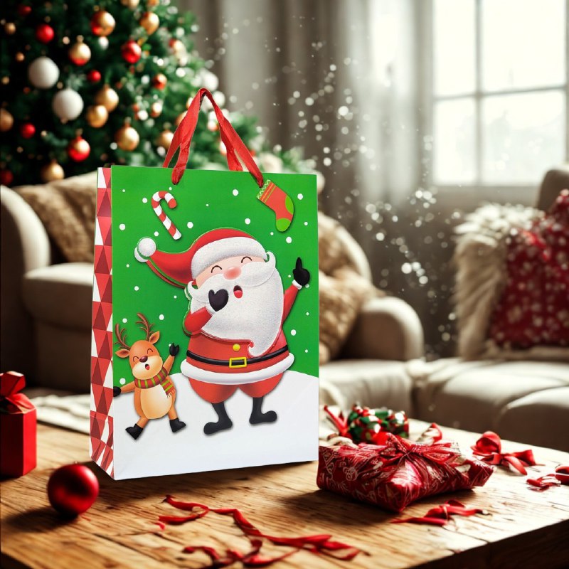 BOLSA DE REGALO NAVIDEÑA MEDIANA CON MEDIDAS DE 26X32X10CM, PERFECTA PARA EMBALAR REGALOS DE TAMAÑO MEDIO. DISEÑO FESTIVO QUE AÑADE UN TOQUE NAVIDEÑO A TUS OBSEQUIOS, HACIÉNDOLOS MÁS ESPECIALES Y ATRACTIVOS. IDEAL PARA SORPRENDER A TUS SERES QUERIDOS CON PRESENTES BIEN ENVUELTOS Y CON ESTILO.