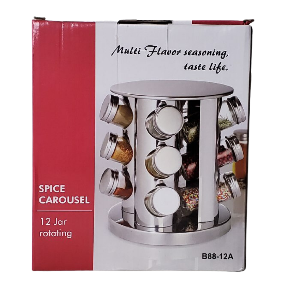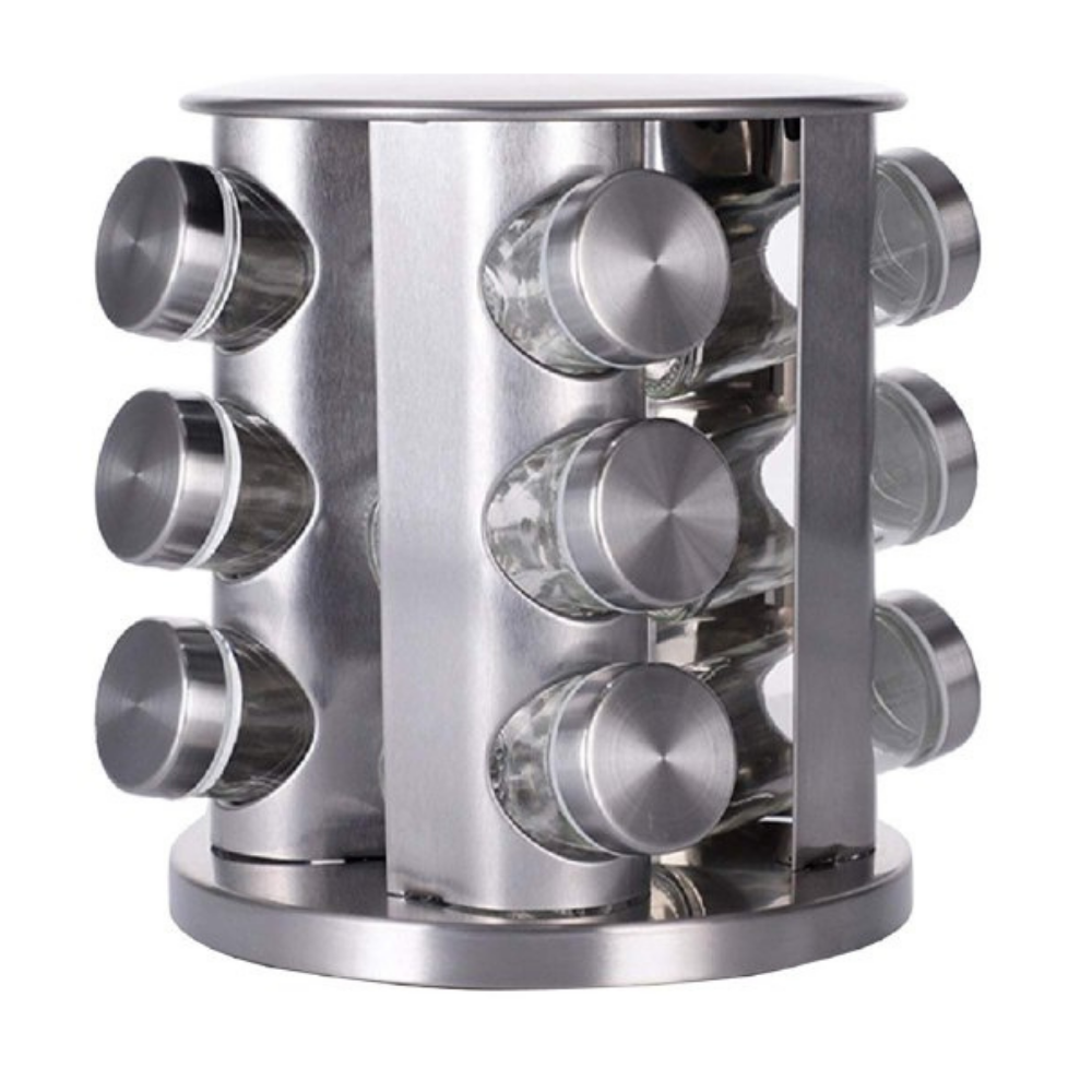 Especiero Giratorio con 12 Botes, Acero Inoxidable, Plateado, botes de vidrio