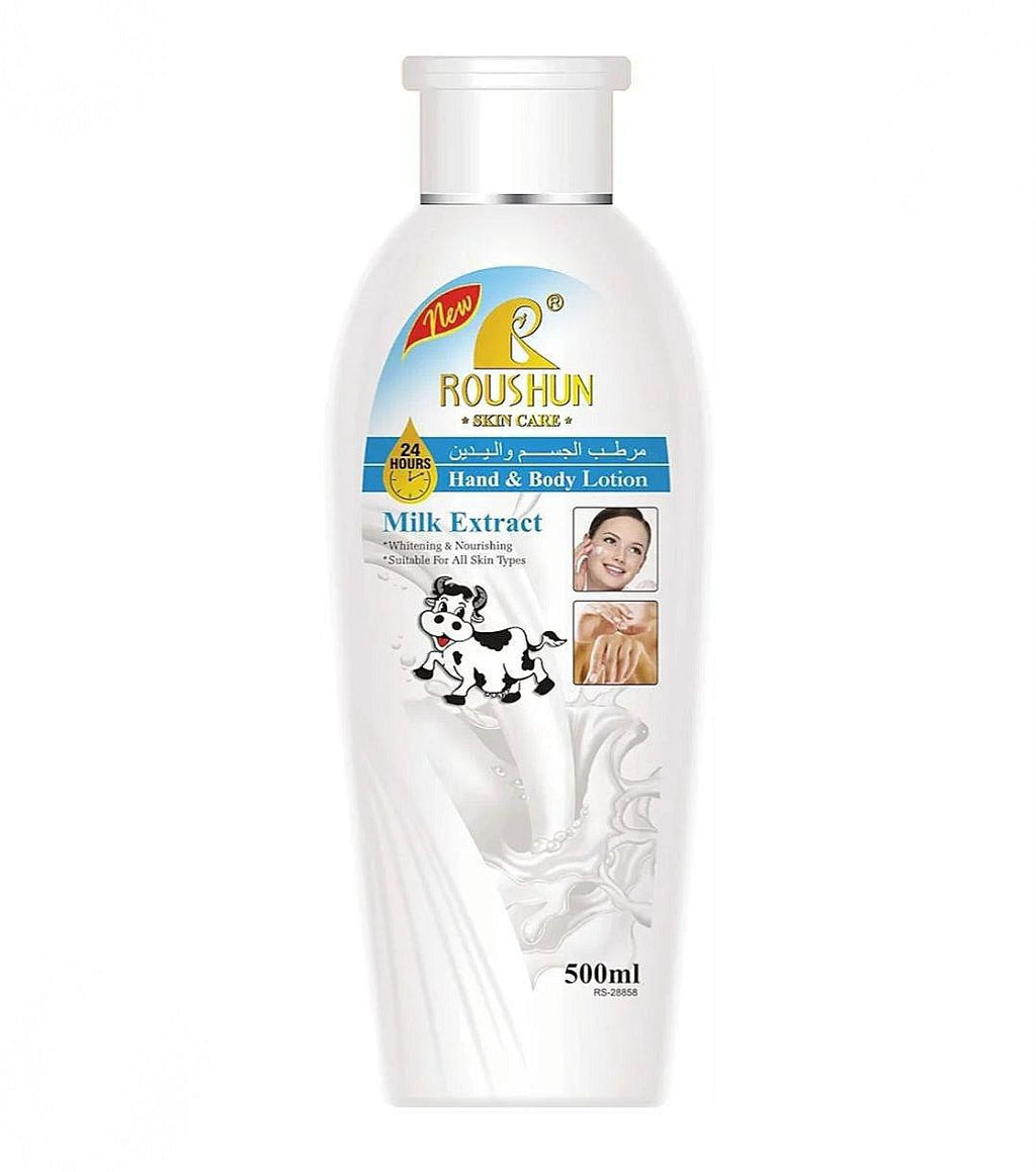 ROUSHUN LOCIÓN CORPORAL PROTECCIÓN DE LA PIEL HASTA POR 24 HORAS CREMA HIDRATANTE Y BLANQUEADORA PARA EL CUERPO Y MANOS DE EXTRACTO DE LECHE APTO PARA TODO TIPO DE PIEL CONT. 500ML