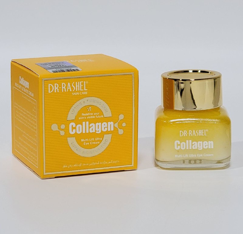 DR. RASHEL COLLAGEN CREMA PARA OJOS MULTI-LIFT ULTRA COLLAGEN EYE CREAM ES UN REAFIRMANTE EXTRA CREMA PARA LA PIEL FINA DEL CONTORNO DE LOS OJOS,LA CREMA ACTÚA SOBRE 3 ZONAS QUE SON FUNDAMENTALES CUANDO SE HABLA DE ANTIENVEJECIMIENTO,OJERAS,BOLSAS BAJO LOS OJOS Y LINEAS FINAS Y ARRUGAS ESTÁ ENRIQUECIDA,ENTRE OTRAS COSAS,CON ÁCIDO HIALURÓNICO,QUE TIENE UN EFECTO SÚPER HIDRATANTE,DE ESTA MANERA,ALISA LA PIEL,POR LO QUE ADQUIERE UNA EXPRESIÓN MÁS JUVENIL,LA PIEL SE VOLVERÁ MÁS FIRME Y FLEXIBLE Y EXPERIMENTARA UN CONTORNO DE OJOS MÁS FRESCO CONT. 15G