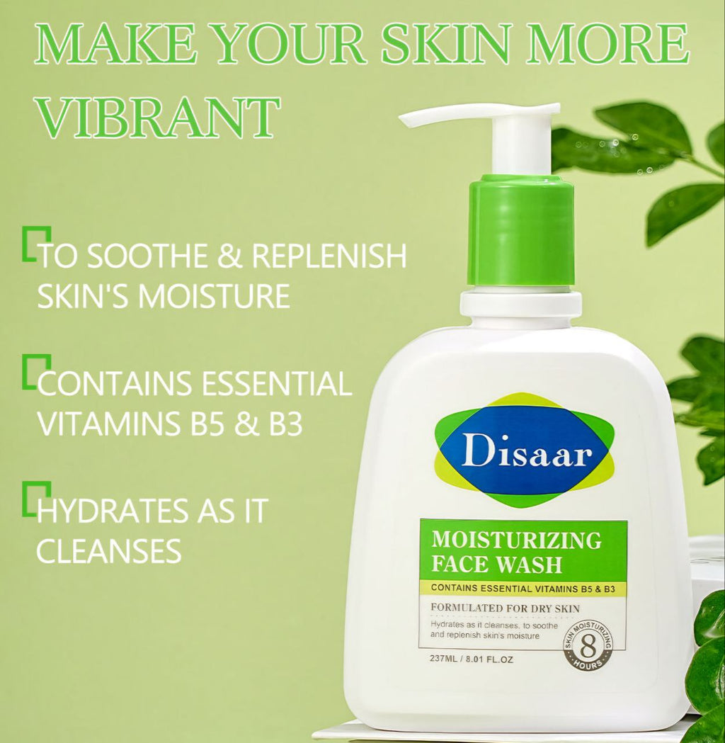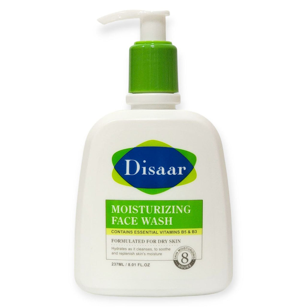 DISAAR MOISTURIZING FACE WASH LAVADO FACIAL HIDRATANTE CONTIENE VITAMINAS ESENCIALES B5 Y B3,FORMULADO PARA PIEL SECA,HIDRATA MIENTRAS LIMPIA,PARA CALMAR Y REPONER LA HUMEDAD DE LA PIEL,ESTE PRODUCTO ESTÁ FORMULADO CON INGREDIENTES SUAVES,FÁCILES DE LIMPIAR,REPONE LA HUMEDAD,MEJORA LA SEQUEDAD,EQUILIBRAR LA HUMEDAD Y LA GRASA,ACLARAR LAS MARCAS DEL ACNÉ,PARA QUE LA PIEL ESTÉ HIDRATADA Y DELICADA CONT. 237ML
