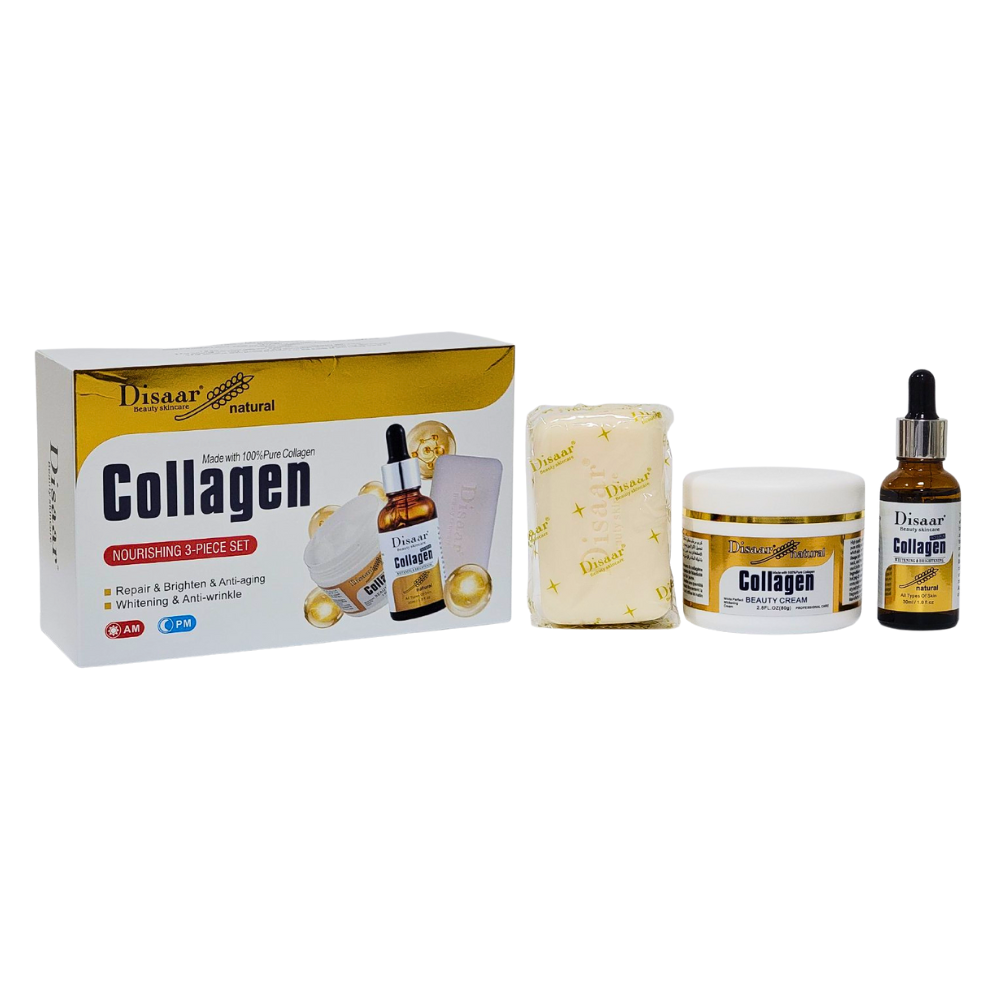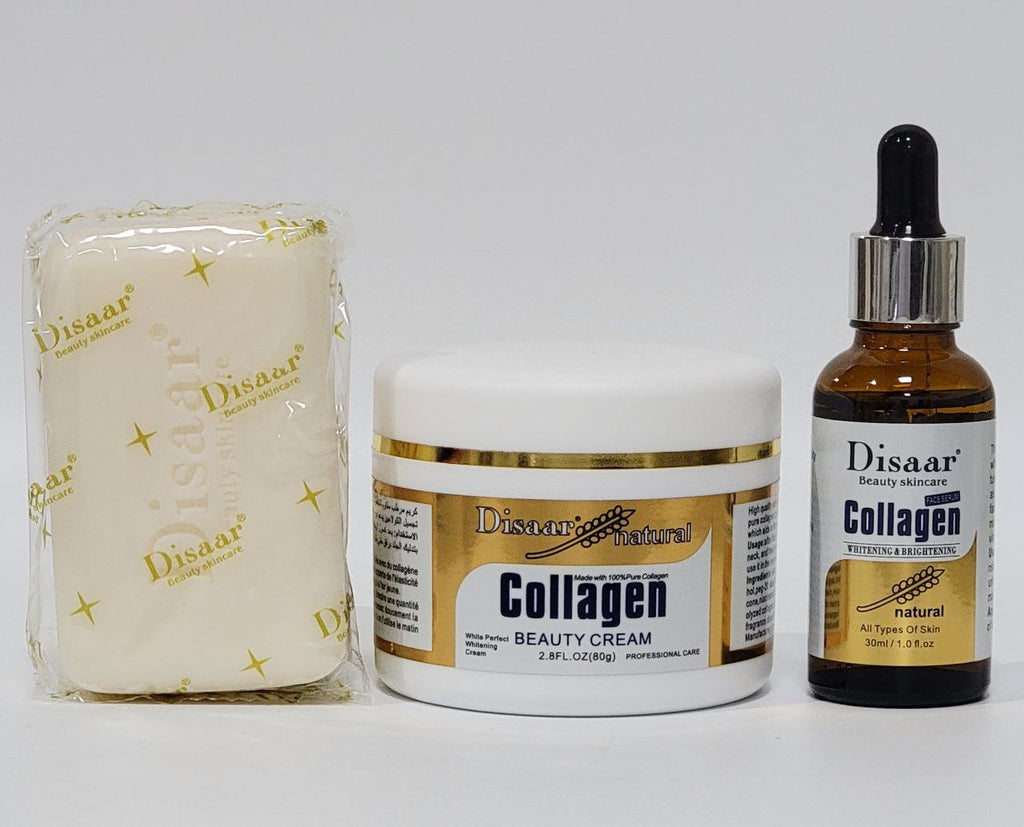 DISAAR BEAUTY SKINCARE NATURAL MADE WITH 100% PURE COLLAGEN SET NUTRITIVO DE 3 PIEZAS REPARA,ILUMINA Y ANTIENVEJECIMIENTO,BLANQUEADOR Y ANTIARRUGAS INCLUYE