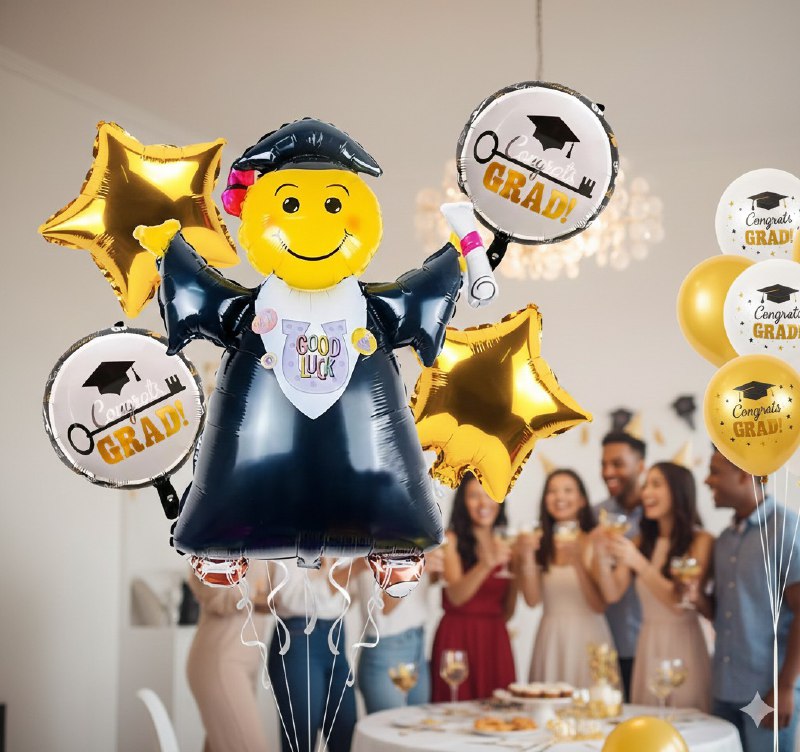 HABILE 5 DECORATION BALLOONS, 5 GLOBOS DE DECORACIÓN, PERFECTA PARA REGALOS O DECORACION DE GRADUACION, INCLUYE DOS GLOBOS EN FORMA DE ESTRELLAS 45CM, DOS GLOBOS REDONDOS CON LETRAS CONGRATS GRAD 45CM, FIGURA DE UN ALUMNO 55CM