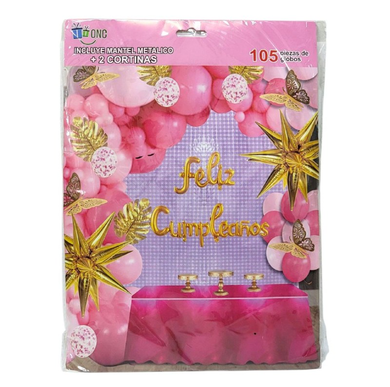 DECORACION PARA CUMPLEAÑOS EN SET COMPLETO, MANTEL METALICO, 2 CORTINAS, 105 GLOBOS