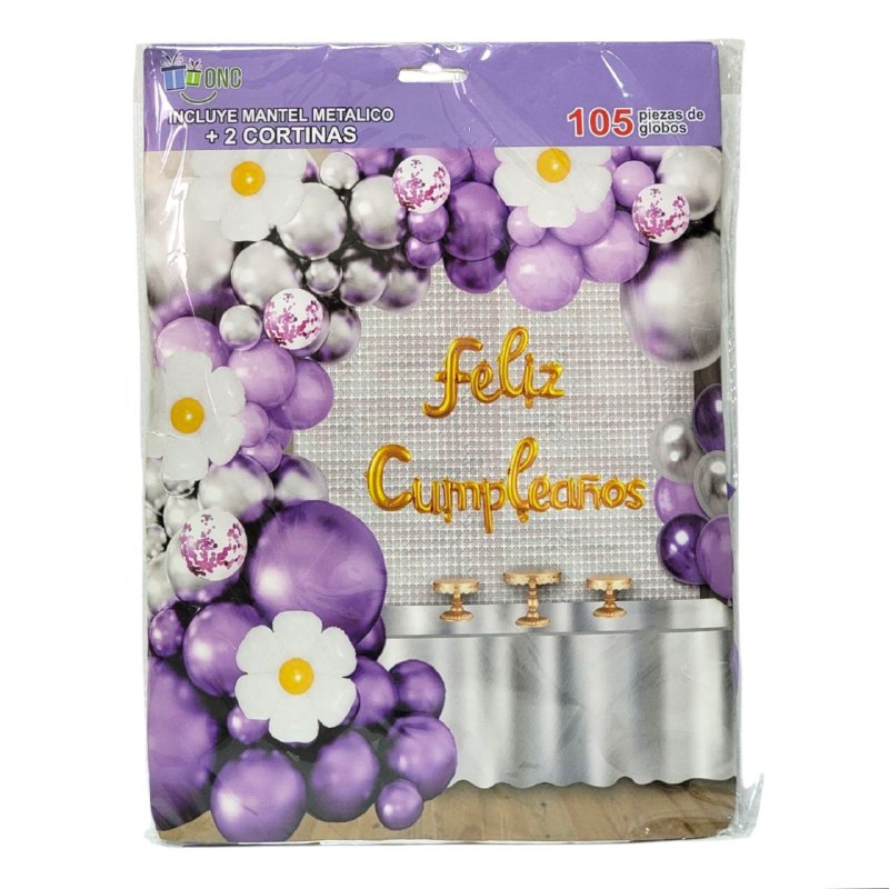 DECORACION PARA CUMPLEAÑOS EN SET COMPLETO, MANTEL METALICO, 2 CORTINAS, 105 GLOBOS