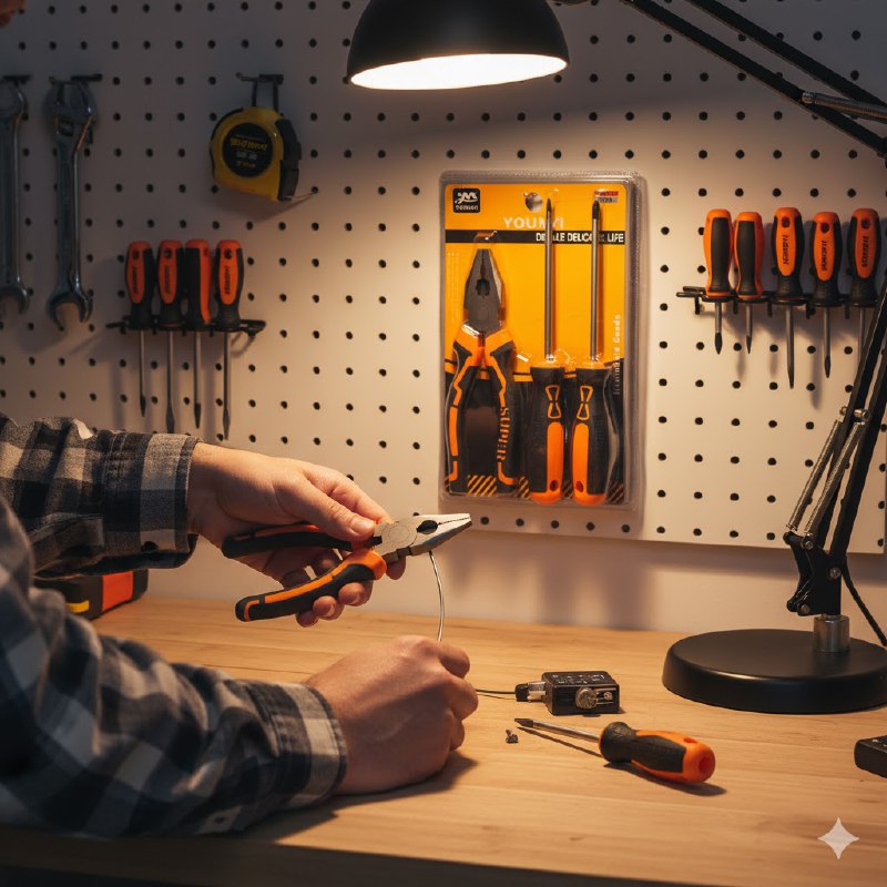 SET DE HERRAMIENTAS BÁSICAS YOUMEI QUE TE OFRECE TODO LO NECESARIO PARA REPARACIONES RÁPIDAS EN CASA. INCLUYE UN ALICATE MULTIUSO VERSÁTIL IDEAL PARA CORTAR, DOBLAR Y SUJETAR CABLES CON PRECISIÓN, MÁS DOS DESTORNILLADORES ERGONÓMICOS CON PUNTAS PLANA Y DE CRUZ QUE SE ADAPTAN A CUALQUIER TORNILLO. DISEÑADO PARA PEQUEÑOS TRABAJOS DEL HOGAR, ESTE KIT COMPACTO TE PERMITE RESOLVER PROBLEMAS SIN COMPLICACIONES Y MANTENER TU ESPACIO EN PERFECTO ESTADO.