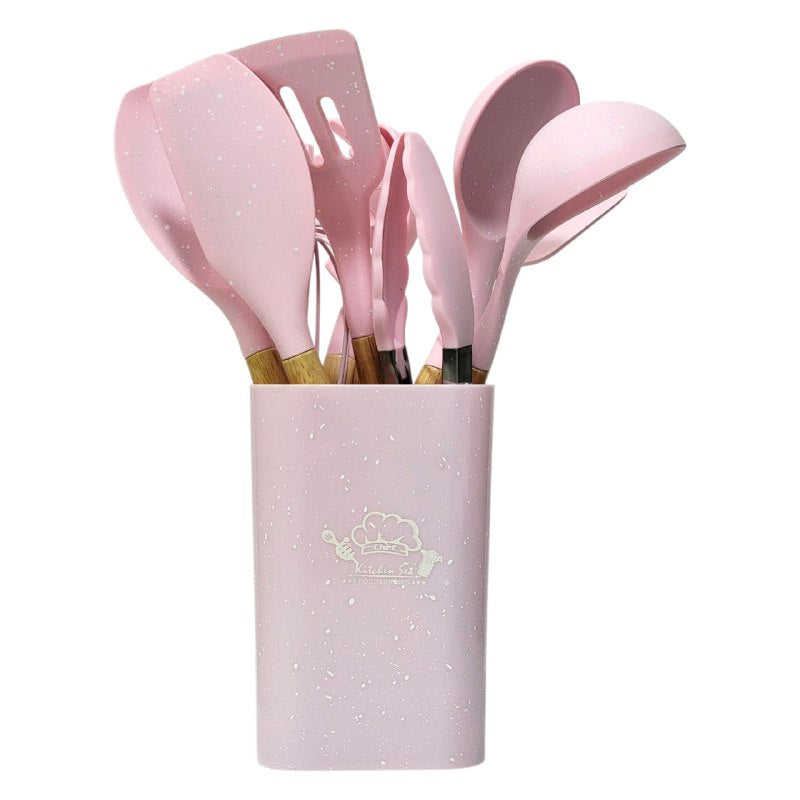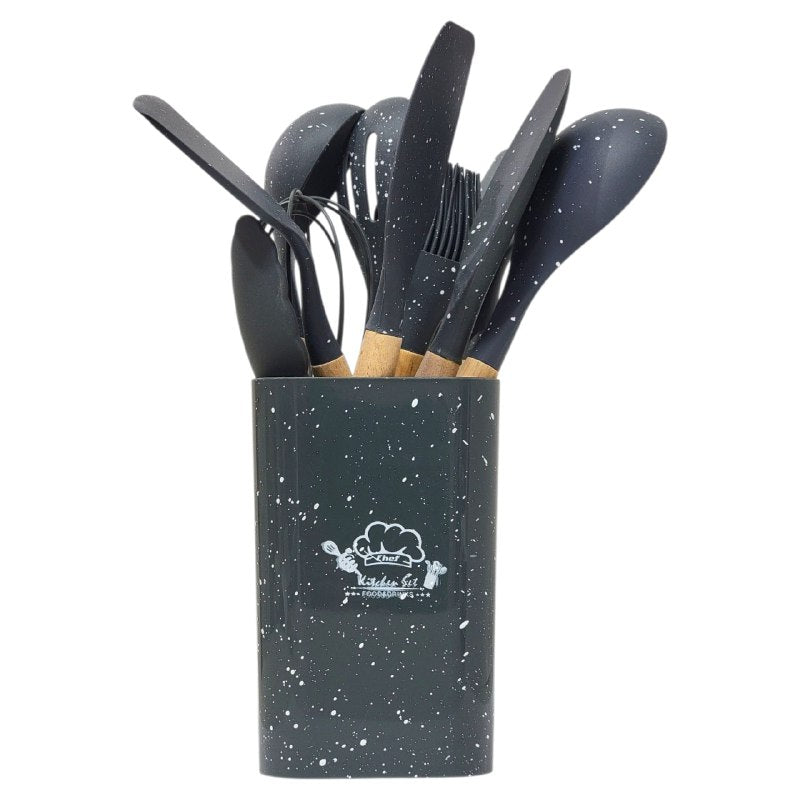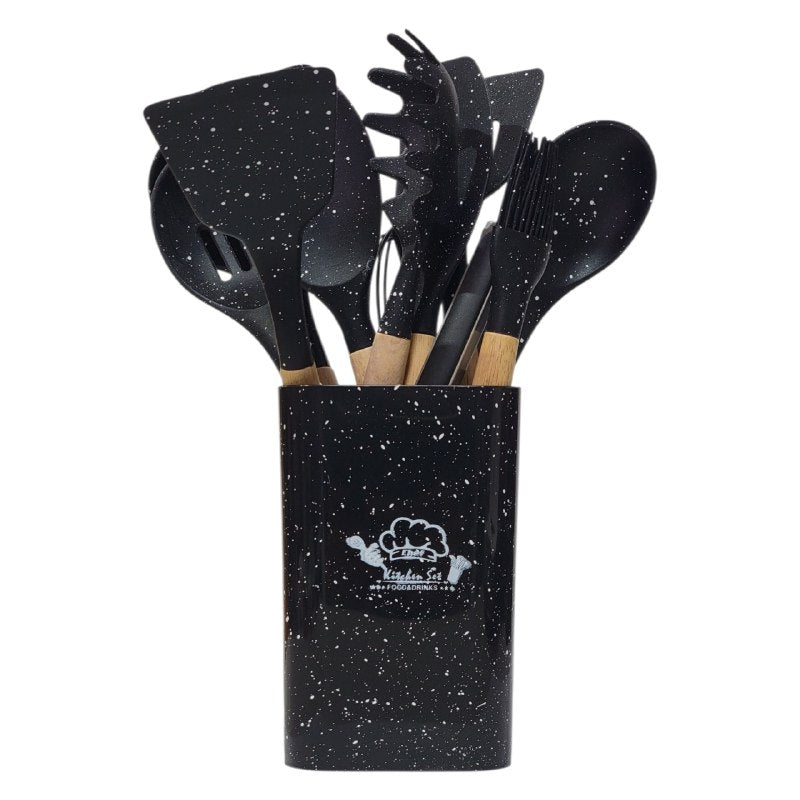 KITCHEN & DINING SET DE UTENSILIOS DE COCINA DE SILICONA CON SOPORTE DE PLÁSTICO, DISEÑADO PARA SOPORTAR TEMPERATURAS DE 30°C A 130°C. SU SILICONA FLEXIBLE Y SUPERFICIE SUAVE EVITAN RAYONES Y MANCHAS EN SUS UTENSILIOS, FACILITANDO LA LIMPIEZA Y PROLONGANDO SU DURABILIDAD. EL DISEÑO REDUCE EL RUIDO AL COCINAR, BRINDÁNDOLE UNA EXPERIENCIA MÁS AGRADABLE. INCLUYE 12 PIEZAS Y ESTÁ DISPONIBLE EN 5 COLORES VIBRANTES PARA DECORAR SU COCINA.