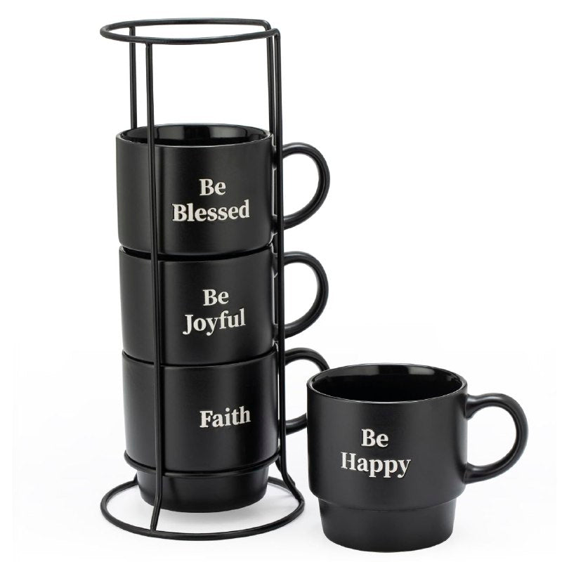 SIGNATURE HOUSEWARES INCORPORATED JUEGO DE 4 TAZAS DE CAFÉ APILABLES DE CERÁMICAS CON ESTANTE DE METAL