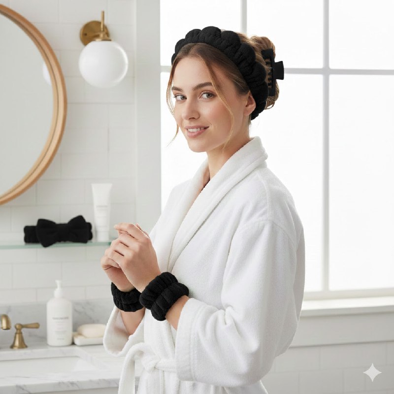 SET DE CUIDADO FACIAL INCLUYE GANCHO PARA EL CABELLO, DOS DIADEMAS Y MUÑEQUERAS PARA SKIN CARE, MAQUILLAJE O SPA 5 COLORES DISPONIBLES