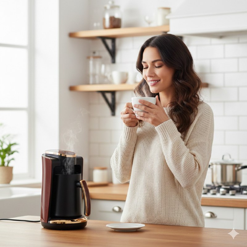 DISEÑO SOFISTICADO DE COLOR NEGRO Y DETALLES EN TONO BROCE/ORO. JARRA ES FACIL DE MANIPULAR GRACIAS A SU ASA ERGONOMICA Y SE COLOCA EN LA BASE PARA UN CALENTAMIENTO SEGURO Y SIN CABLES.