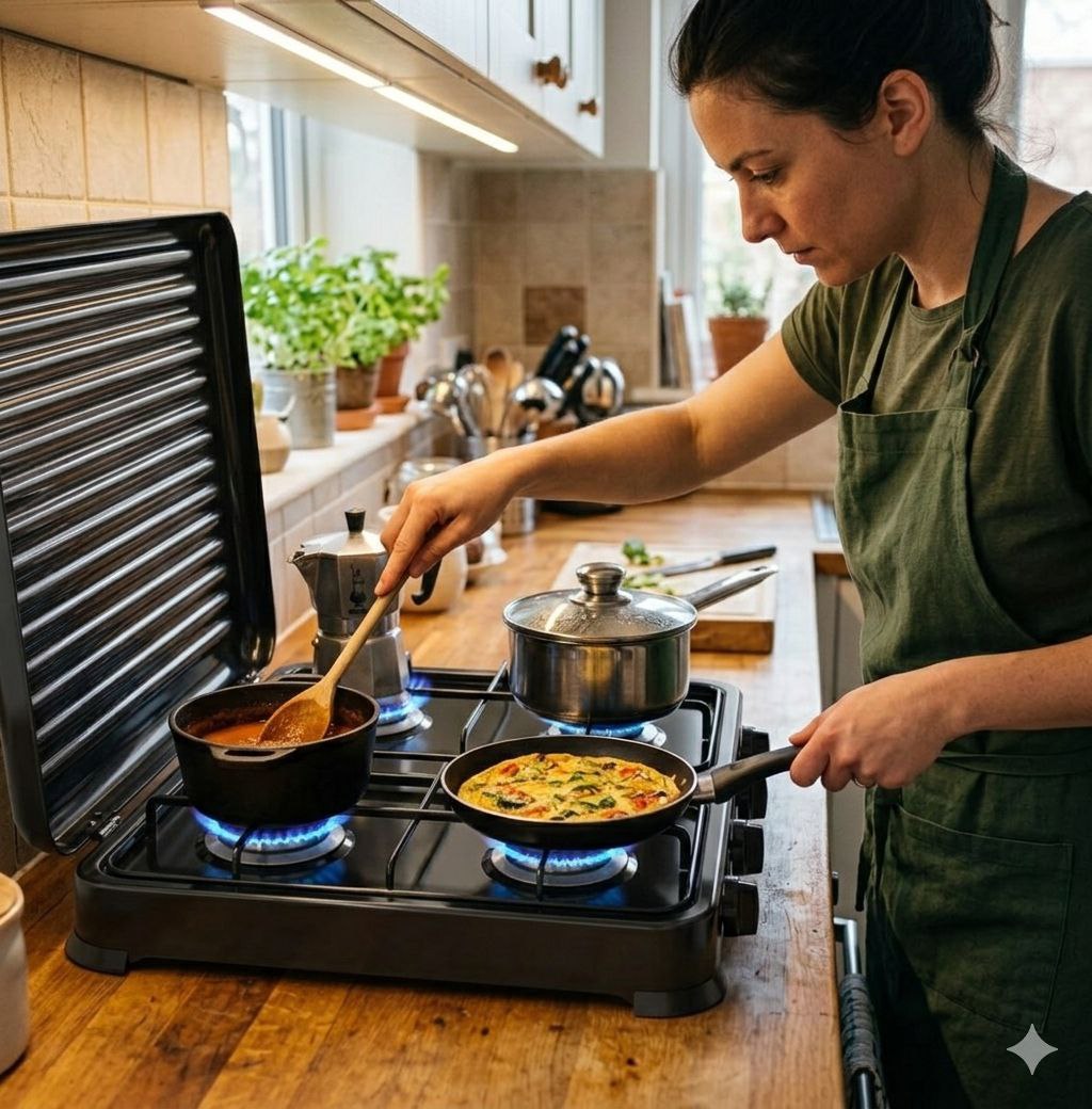Beneficios principales: • Alta potencia de 8.8 kW para una cocción rápida y eficiente. • Superficie generosa compatible con ollas y sartenes de todos los tamaños. • Diseño optimizado para el ahorro de energía y protección del medio ambiente. • Ideal para uso en exteriores como jardín, camping, picnics o viajes. • Operación sencilla con controles mecánicos independientes.