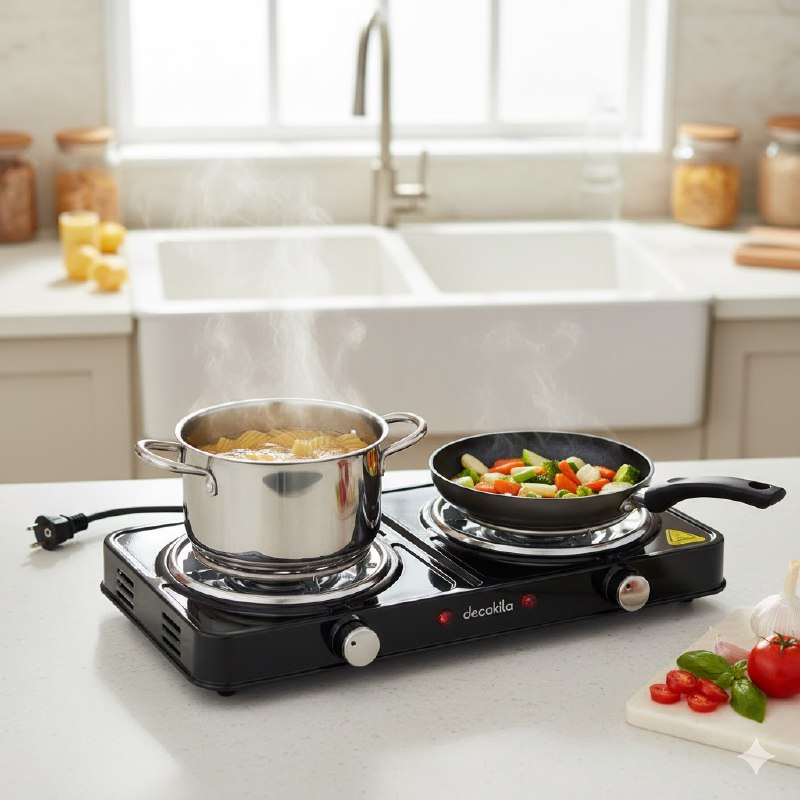 DECAKILA COCINA ELECTRICA PORTATIL, COCINA EN CUALQUIER MOMENTO Y EN CUALQUIER LUGAR, CON POTENTE CALENTAMIENTO DE 1000W + 1000W, DOBLE QUEMADOR, FACIL DE CONTROLAR.