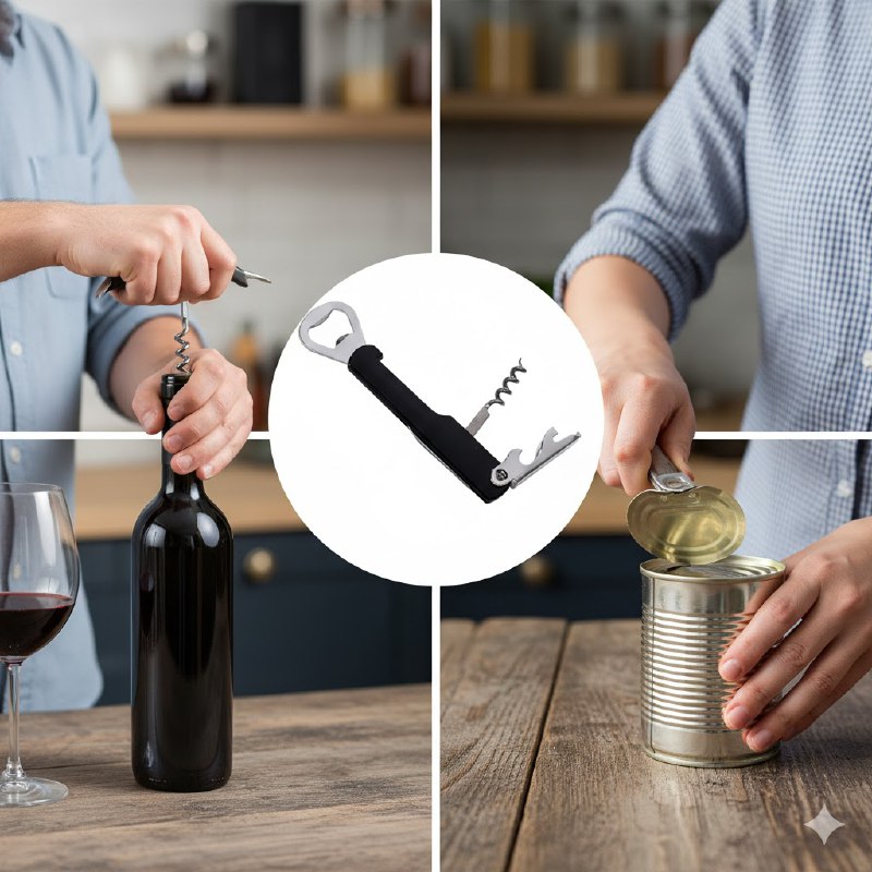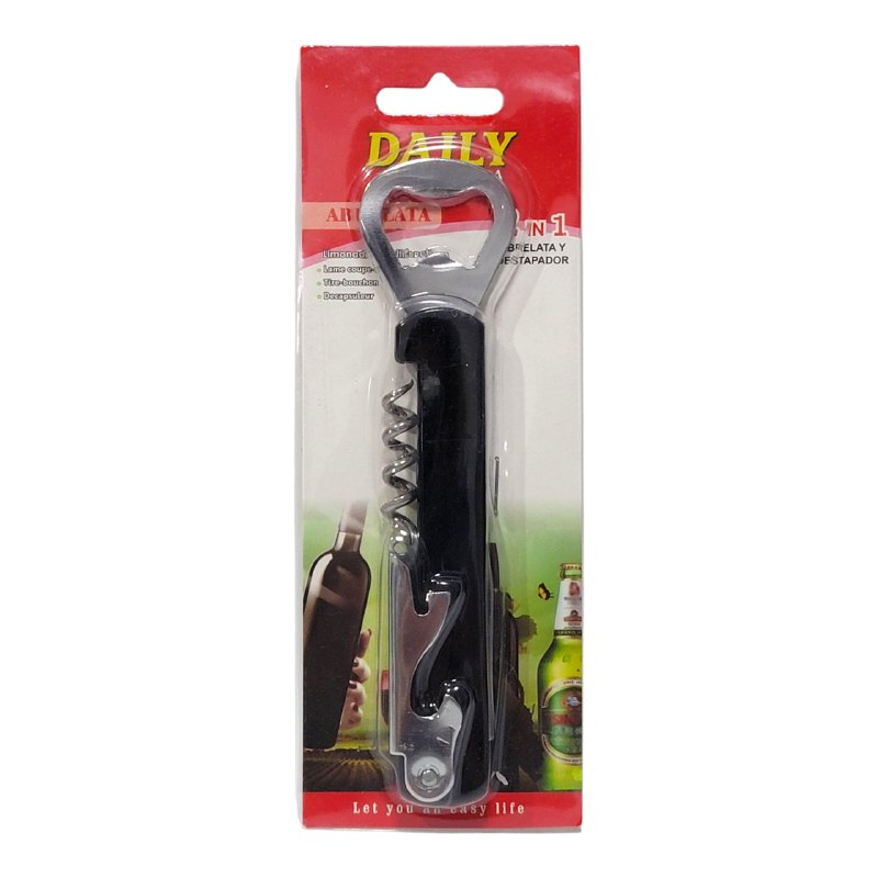 DAILY ABRELATA Y DESTAPADOR MULTIFUNCIONAL 3 EN 1 PARA BOTELLAS DE CERVEZA Y VINO, SACACORCHOS DE GUSANO METÁLICO: PARA DESCORCHAR BOTELLAS DE VINO DE FORMA LIMPIA Y SIN ESFUERZO. ABRIDOR DE BOTELLAS (SUPERIOR): DESTAPA CERVEZAS Y REFRESCOS AL INSTANTE. CUCHILLO/PALANCA PLEGABLE: IDEAL PARA REMOVER EL SELLO DEL VINO Y ACTUAR COMO PALANCA DE APOYO.