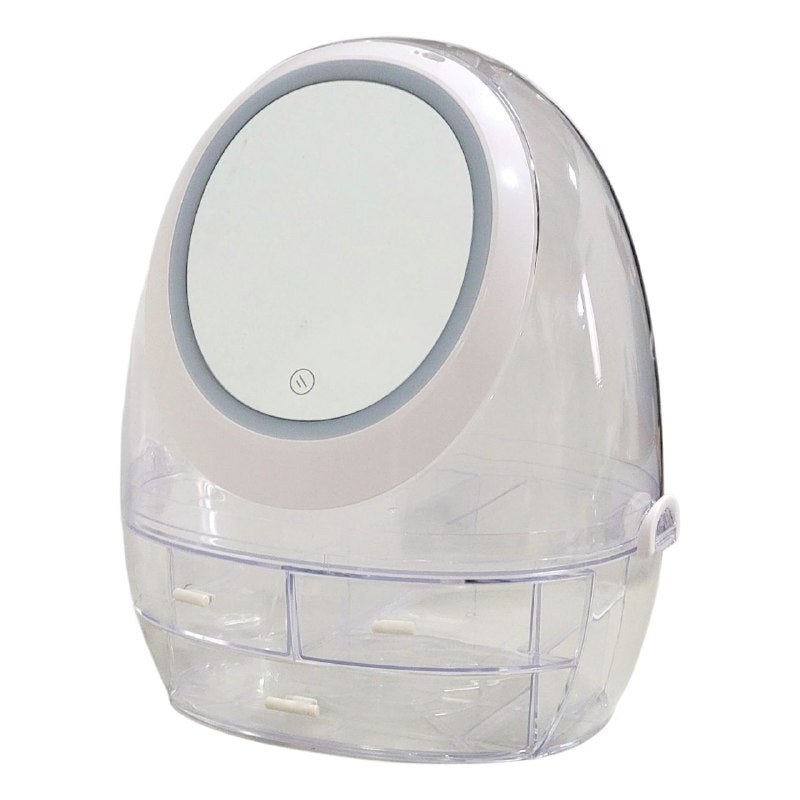 ORGANIZADOR DE COSMETICOS O MAQUILLAJE,CON 4 COMPARTIMIENTOS,ESPEJO CON LUZ LED DE 3 CAMBIOS DE INTENSIDAD COLOR TRANSPARENTEMEDIDA 32X25.5X39CM