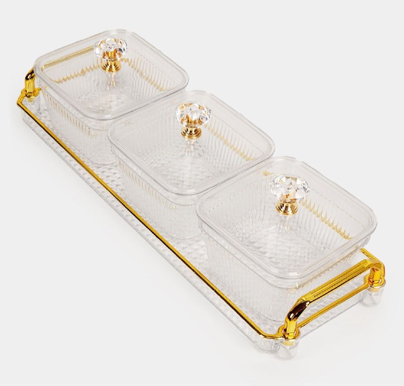 MULTIFUNCTIONAL STORAGE BOX CAJA DE ALMACENAMIENTO MULTIFUNCIONAL DE ACRILICO DURADERA Y ELEGANTE INCLUYE 3 RECIPIENTES CON BANDEJA IDEAL PARA POSTRES,DULCES O FRUTOS SECOS
