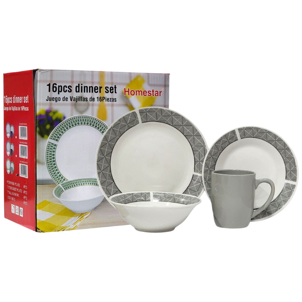 HOMESTAR JUEGO DE VAJILLA SUPERFICIE MUY DURA,DIFICIL DE ROMPER,NO SE DEFORMA,FÁCIL CUIDADO INCLUYE 16 PIEZAS