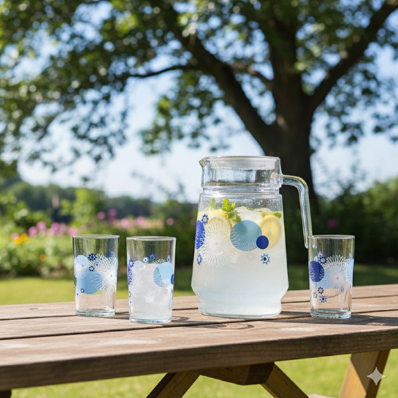 GLASS WARE, SET DE JARRA Y 7 VASOS PARA LA COMBINACION PERFECTA DE UTILIDAD Y BELLEZA, SU DISEÑO FLORAL EN TONOS AZULES, AÑADE UN TOQUE VIBRANTE Y SOFISTICADO A TU MESA