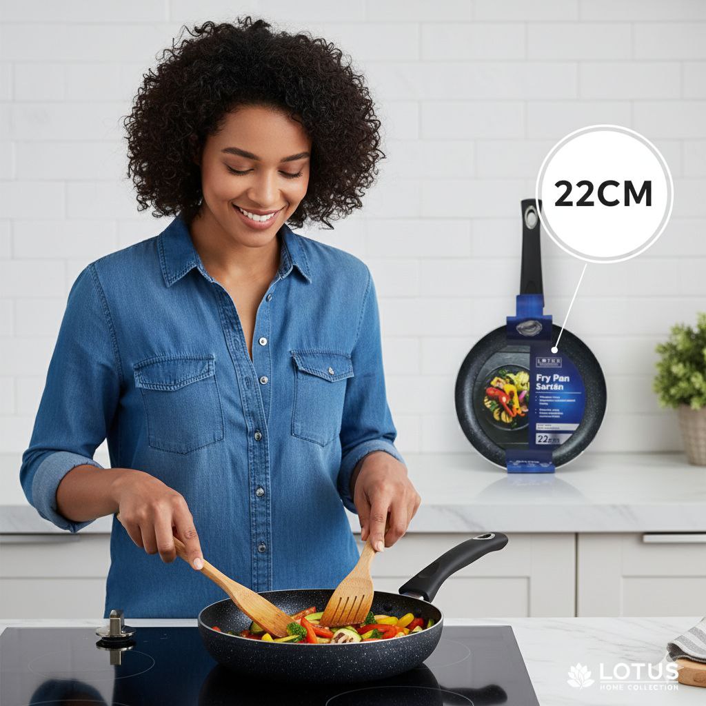 SARTÉN CON AVANZADO REVESTIMIENTO DE MÁRMOL ANTIADHERENTE. TE PERMITE COCINAR CON MENOS ACEITE, HACIENDO TUS COMIDAS MÁS SALUDABLES. GROSOR DE 2.5MM PARA UNA DISTRIBUCIÓN UNIFORME DEL CALOR. MANGO ERGONÓMICO QUE NO SE CALIENTA, BRINDÁNDOTE TOTAL SEGURIDAD.