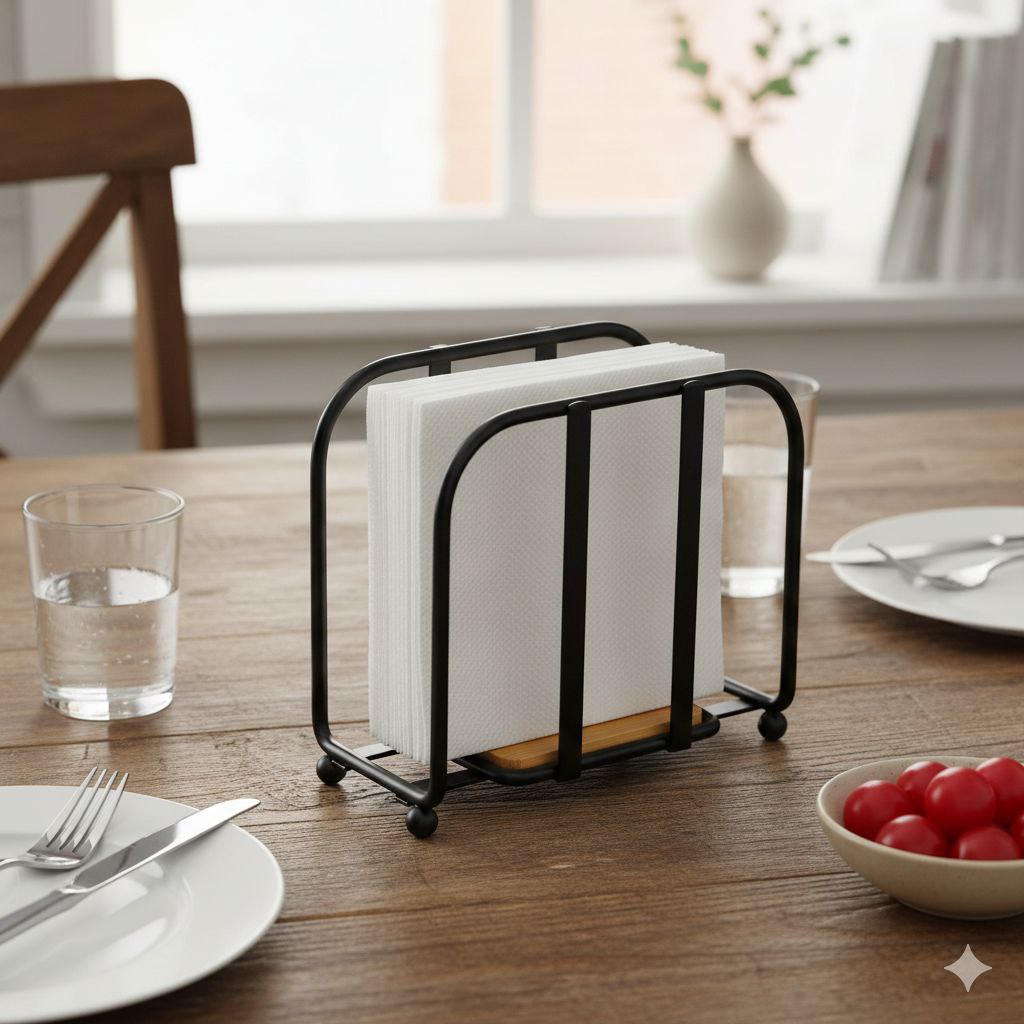 ELEVA LA PRESENTACIÓN DE TU MESA O BARRA CON ESTE SERVILLETERO DE DISEÑO CONTEMPORÁNEO. FABRICADO EN METAL NEGRO MATE CON UNA BASE DE BAMBÚ. SU ESTILO MINIMALISTA CREA UN TOQUE SOFISTICADO QUE SE INTEGRA PERFECTAMENTE EN COCINAS MODERNAS, COMEDORES INDUSTRIALES O MESAS DE OFICINA.