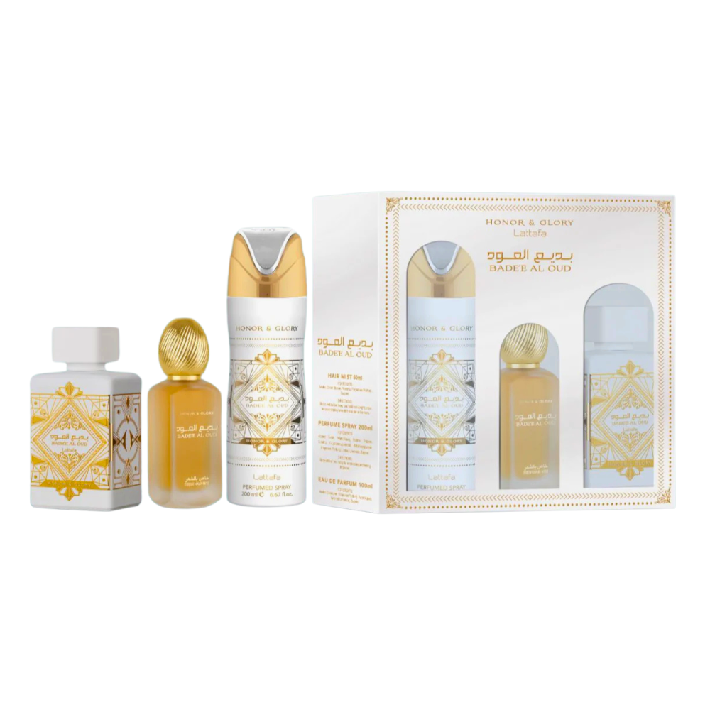 SET LATTAFA BADEE AL OUD HONOR & GLORY EDP 100ML, HAIR MIST 50ML, BODY SPRAY 200ML (U)