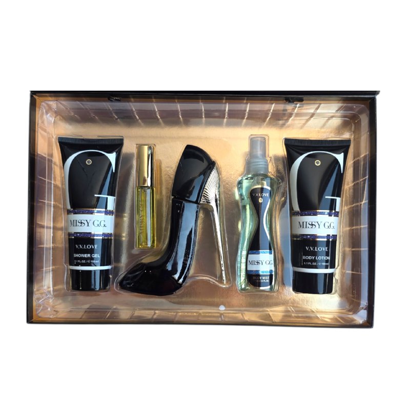 SET DE 5 PIEZAS PERFUME ECONÓMICO V.V LOVE MISSY G.G. PARA DAMA BODY MIST CONT.100ML SHOWER GEL CONT.150ML BODY LOTION CONT.150ML EDP CONT.100ML EDP CONT.10ML
