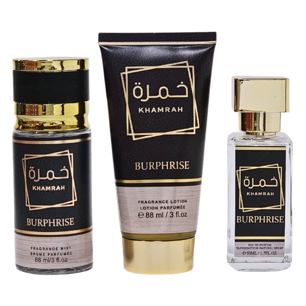 PERFUME ECONÓMICO ÁRABE SET DE 3 PIEZAS KHAMRAH BURPHRISE INCLUYEFRAGRANCE LOTION 88MLBODY MIST 88MLEDP 50ML