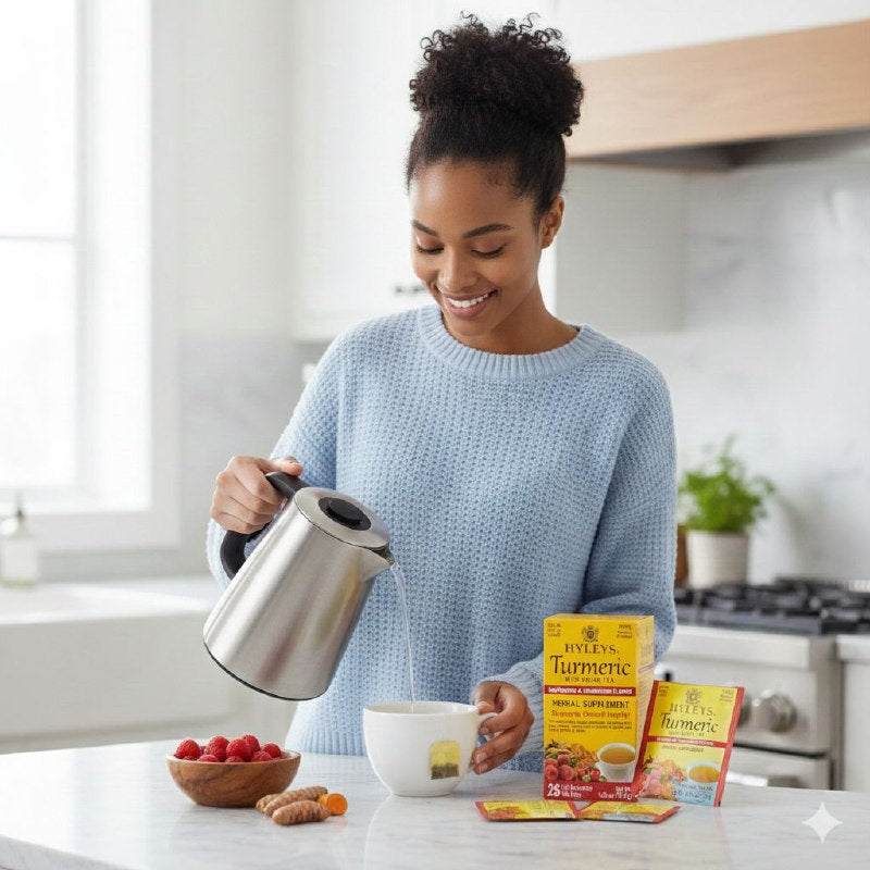 PRODUCTO AMERICANO, HYLEYS TURMERIC WITH GREEN TEA HERBAL SUPPLEMENT, SABOR A RASPERRY AND CRANBERRY, FRAMBUESA Y ARÁNDANO, TÉ DE CÚRCUMA CON TÉ VERDE, ESTE SUPLEMENTO HERBAL COMBINA HOJAS DE TÉ VERDE SECAS Y RAÍZ DE CÚRCUMA PARA APOYAR EL BIENESTAR GENERAL, ES UN PRODUCTO 100% NATURAL SIN SABORES NI CONSERVANTES ARTIFICIALES Y NATURALMENTE POCO CAFEINADO, AYUDA A REFORZAR EL SISTEMA INMUNOLÓGICO GRACIAS A SUS PROPIEDADES ANTIOXIDANTES, LA CAJA CONTIENE 25 BOLSITAS ENVUELTAS INDIVIDUALMENTE PARA PRESERVAR LA FRESCURA, SE PUEDE DISFRUTAR CALIENTE O FRÍO, PARA OBTENER EL MÁXIMO BENEFICIO SE SUGIERE MANTENER UNA DIETA SALUDABLE Y EJERCICIO REGULAR, CONT. 25PCS X 1.5G C/U
