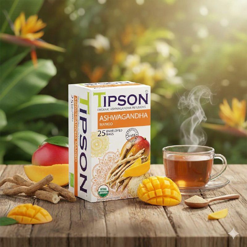 PRODUCTO AMERICANO TIPSON ORGANIC ASHWAGANDHA INFUSIONS ASHWAGANDHA CONT. MANGO 25 BOLSAS ENVUELTAS ORGÁNICAS SIN CAFEÍNA NATURALMENTE CON CERTIFICACIÓN USDA ORGANIC PESO NETO 30G EL ASHWAGANDHA ES UNA HIERBA ADAPTÓGENA CONOCIDA POR AYUDAR A REDUCIR EL ESTRÉS Y LA ANSIEDAD PROMOVER LA CALMA MEJORAR LA FUNCIÓN COGNITIVA Y EL RENDIMIENTO DE LA MEMORIA APOYAR LA FUNCIÓN INMUNE Y POTENCIALMENTE MEJORAR LA ENERGÍA Y LA VITALIDAD GENERAL.