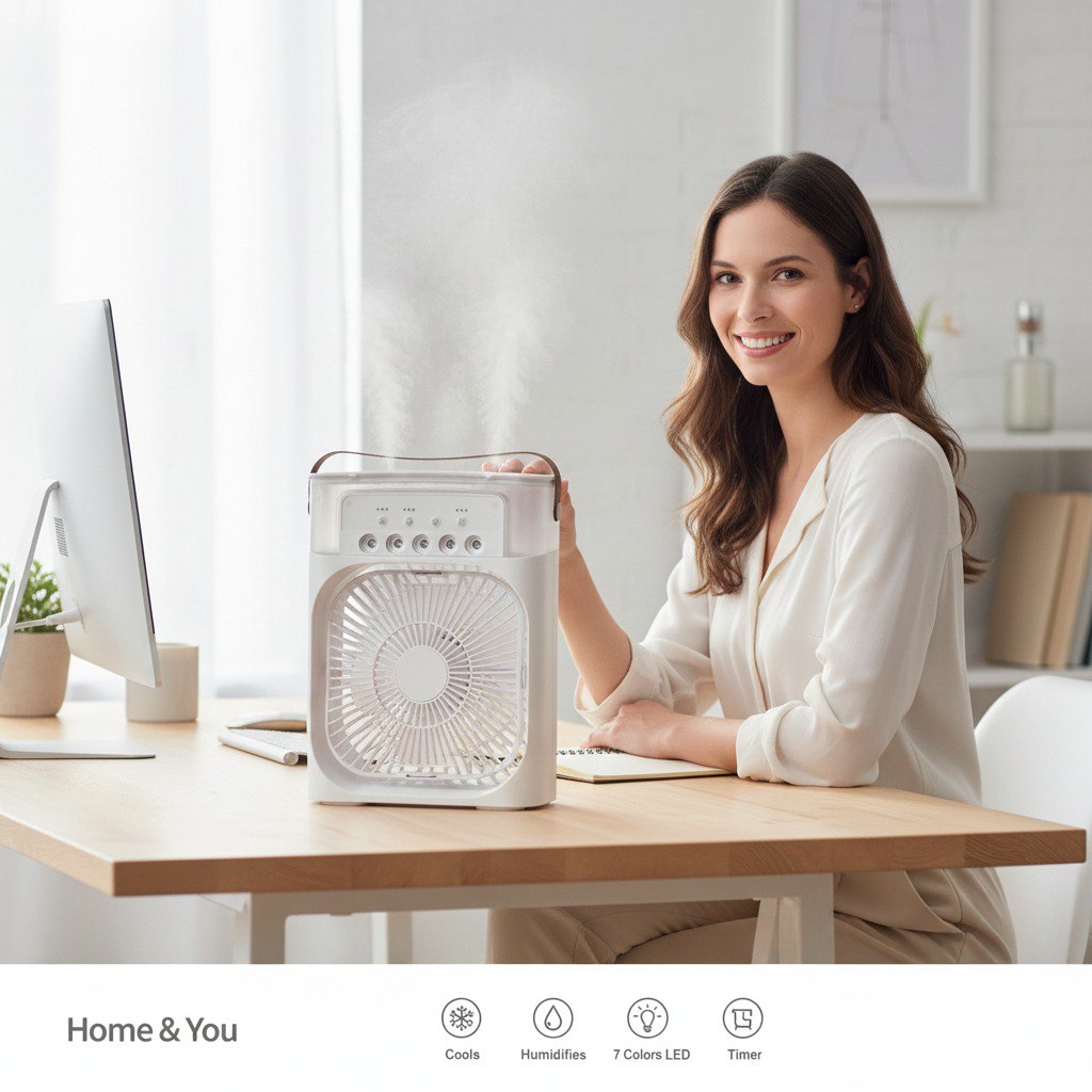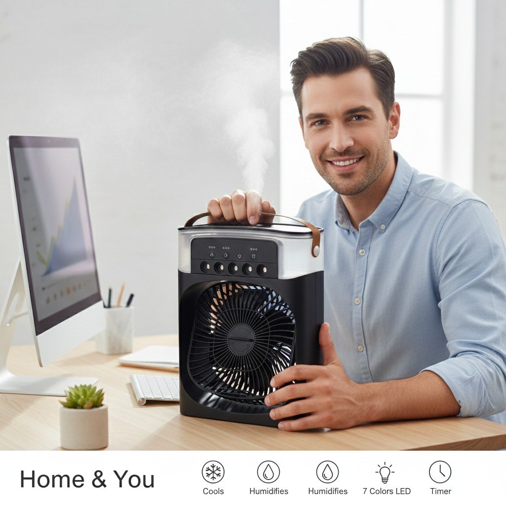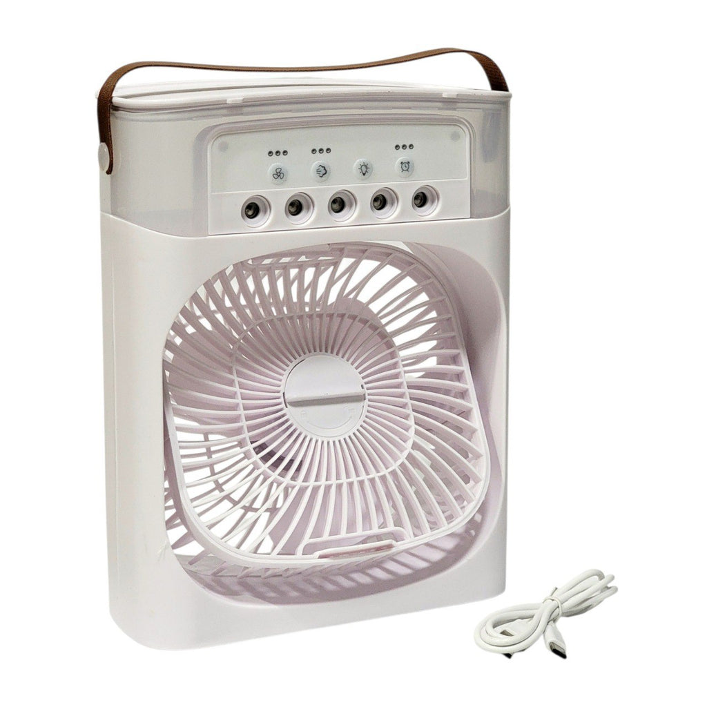 AIR COOLER FAN VENTILADOR PORTATIL, HUMIDIFICA Y REFRIGERA USANDO AGUA O HIELO, TIMER DE 1, 2 O 3 HORAS PARA DORMIR SIN PREOCUPACIONES, TECNOLOGÍA DE TURBINA DE 3 VELOCIDADES, DISFRUTA DE UN AIRE MÁS LIMPIO Y FRESCO, PERFECTO PARA TRABAJAR DESDE CASA O PARA QUE LOS NIÑOS DUERMAN FRESCOS. INCLUYE ASA DE TRANSPORTE Y CONEXIÓN USB, DISPONIBLE EN 2 COLORES, MEDIDA: 20X26CM