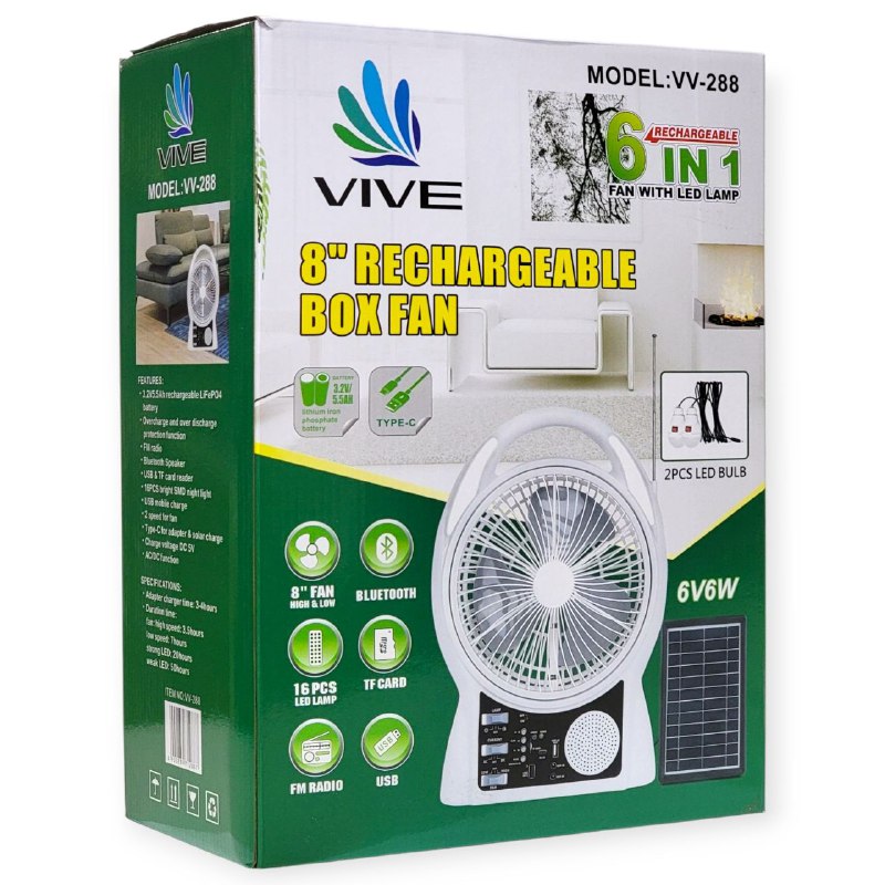 VIVE VENTILADOR DE CAJA RECARGABLE DE 8 PULGADAS,ALTO Y BAJO,BLUETOOTH,LÁMPARA LED DE 16 PIEZAS,TARJETA TF,2 BOMBILLAS LED,RADIO FM,LECTOR DE TARJETA USB Y TF,FUNSIÓN DE PROTECCIÓN CONTRA SOBRECARGA Y SOBREDESCARGA,CARGA MOVIL USB,2 VELOCIDADES PARA VENTILADOR,TIPO C PARA ADAPTADOR Y CARGA SOLAR,VOLTAJE DE CARGA DC 5V,FUNCIÓN CA/CC,TIEMPO DE CARGA DEL ADAPTADOR 3-4 HORAS,VENTILADOR ALTA VELOCIDAD 3-5 HORAS,BAJA VELOCIDAD 7 HORAS,LED FUERTE 20 HORAS,LED DÉBIL 50 HORAS