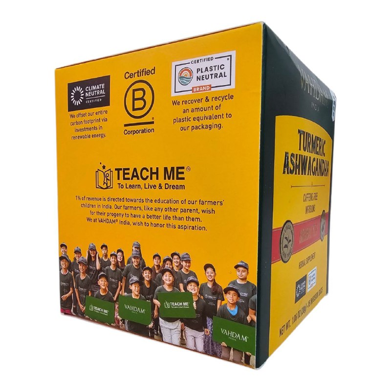 VAHDAM INDIA, TURMERIC ASHWAGANDHA (TÉ DE HIERBAS DE CÚRCUMA Y ASHWAGANDHA), INFUSIÓN SIN CAFEÍNA, CONOCIDA POR SUS PROPIEDADES CALMANTES Y ANTIINFLAMATORIAS, SABOR CÚRCUMA Y ASHWAGANDHA CON NOTAS DE LIMONCILLO REGALIZ Y PIMIENTA NEGRA, SIN OMG SIN GLUTEN VEGANO ORGÁNICO CERTIFICADO POR USDA Y NEUTRO EN CARBONO Y PLÁSTICO, AYUDA A CONTROLAR EL ESTRÉS Y LA ANSIEDAD MEJORAR LA CALIDAD DEL SUEÑO REFORZAR EL SISTEMA INMUNOLÓGICO Y REDUCIR LA INFLAMACIÓN, SE PUEDE SERVIR CALIENTE O FRÍO