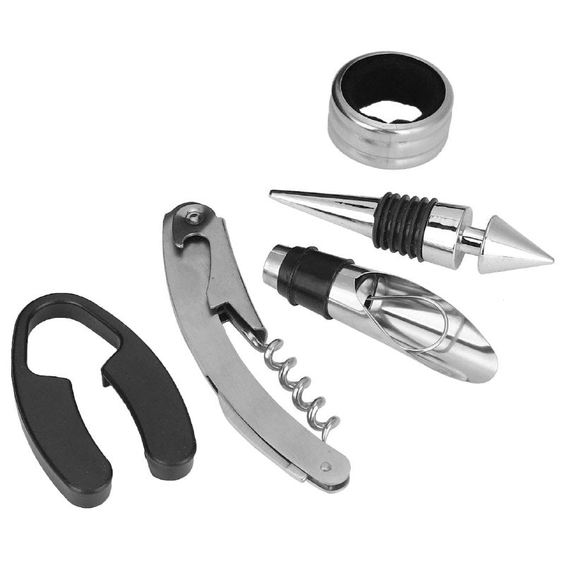 SET DE HERRAMIENTAS PARA BOTELLAS DE VINO DE 5 PIEZAS INCLUYE VERTEDOR DE VINO,TAPÓN,CORTADOR DE ALUMINIO,ANILLO DE GOTEO Y SACACORCHOS,ESTUCHE DE TRANSPORTE CON FORMA DE BOTELLA MEDIDA 32X10CM
