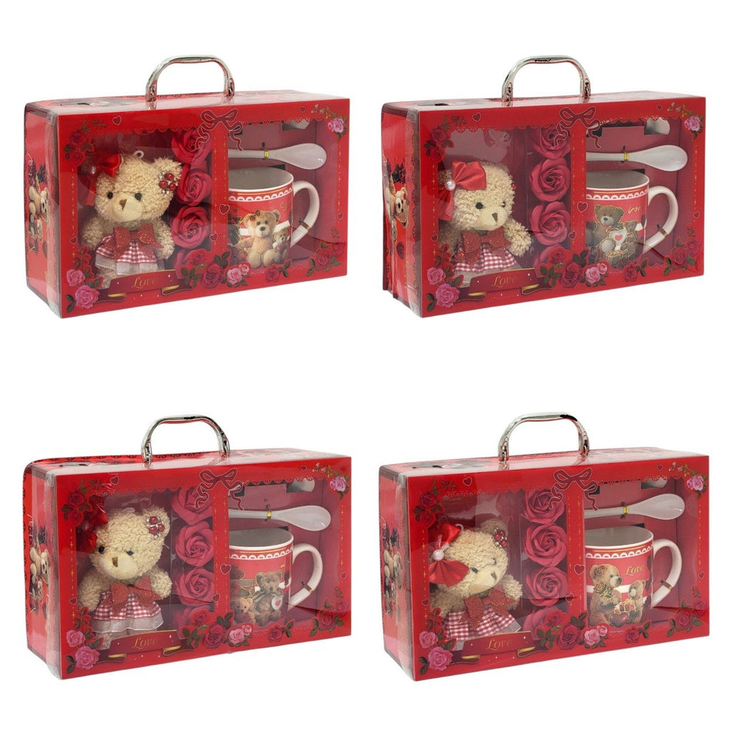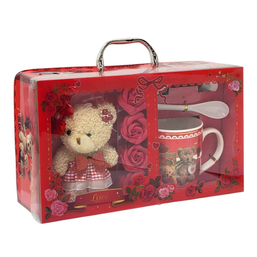 Contenido del set: 1 Taza, 1 Plato, 1 Cuchara de cerámica y 1 Oso de peluche con detalles de rosas.